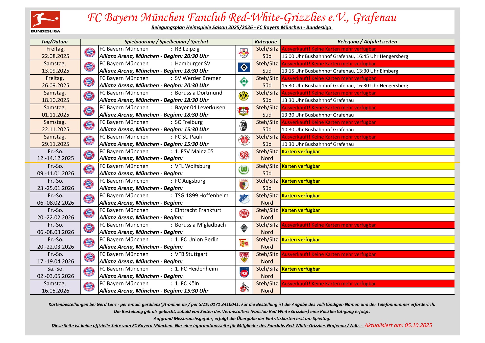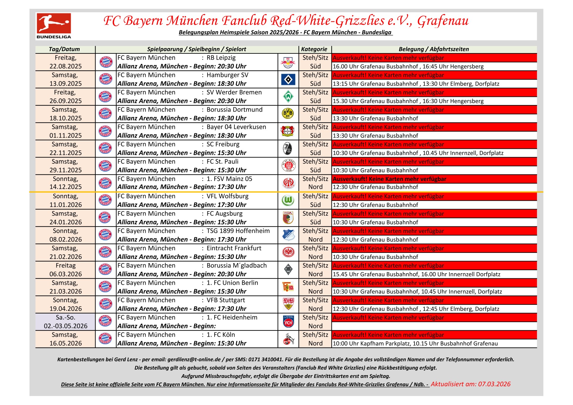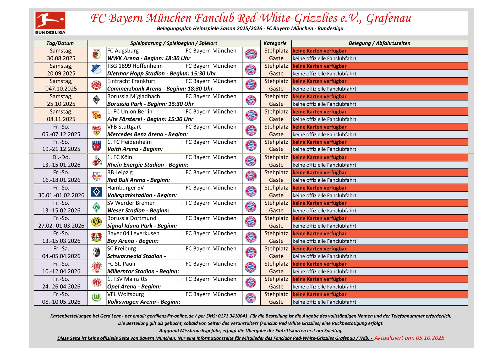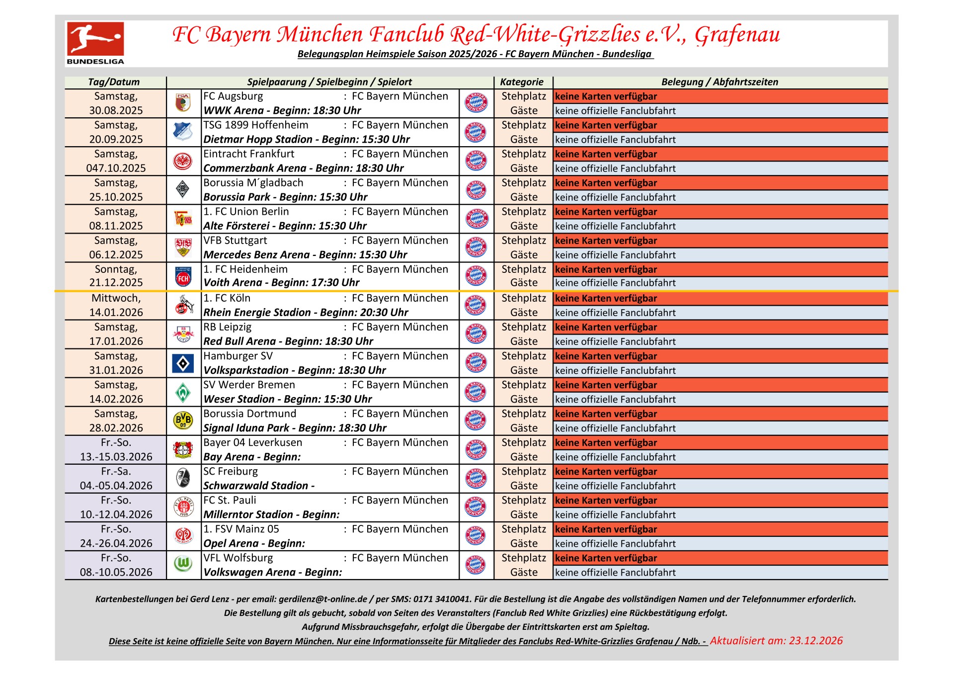 Information für Bundesliga Auswärtsspiele: Dem Fanclub Red White Grizzlies e.V., Grafenau steht kein Bundesliga Auswärtskontigent zur Verfügung. Eine Zuteilung von Bundesliga Auswärtskarten erfolgt nur über Bayern München im Losverfahren. Der Fanclub hat keinen Einfluss auf diese Zuteilung. Erfolgt eine Zuteilung, erhält der Fanclub maximal 8 Karten.