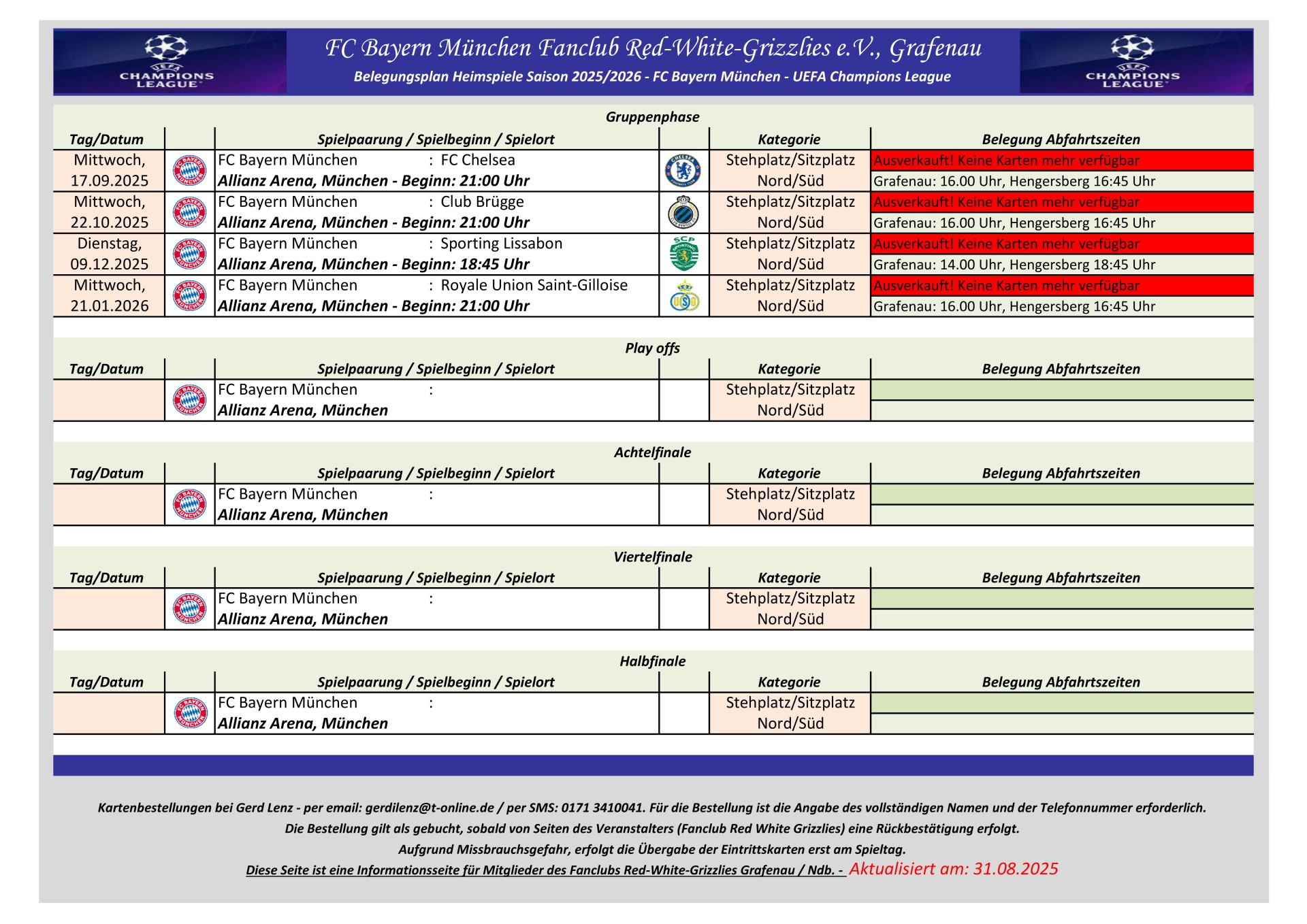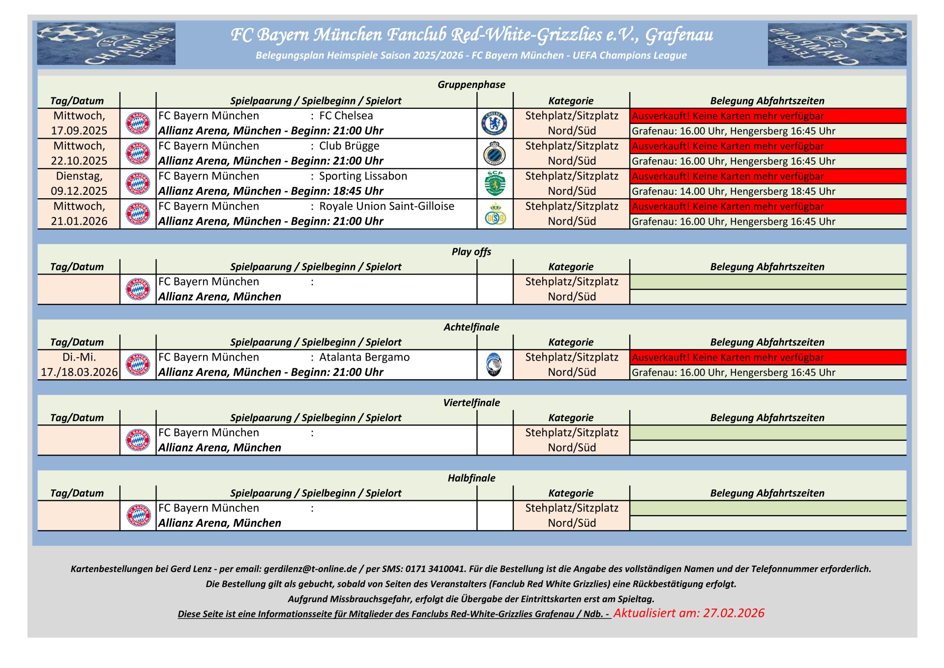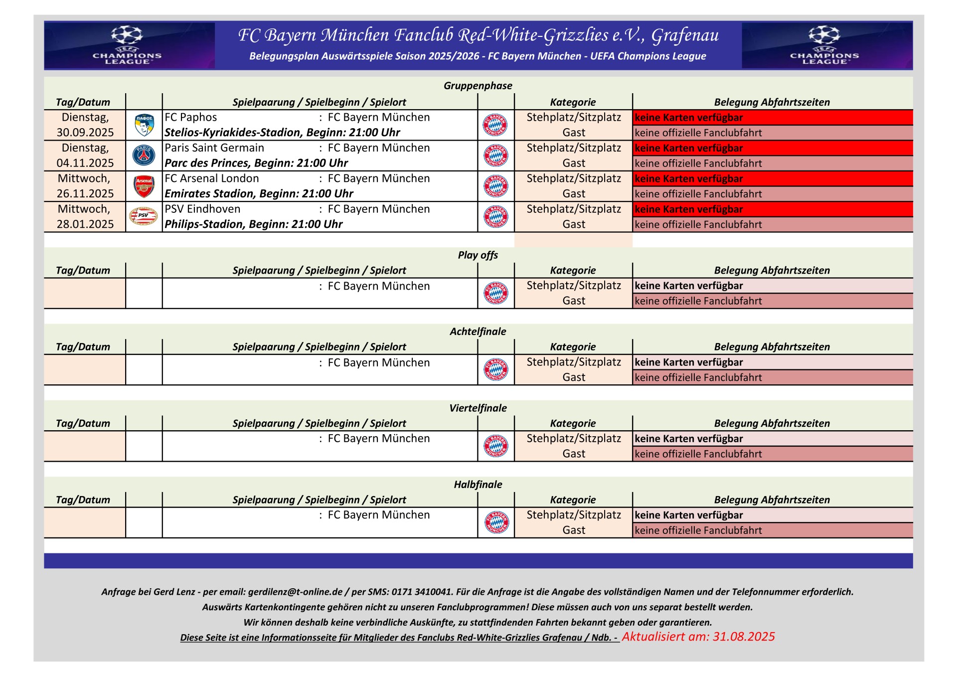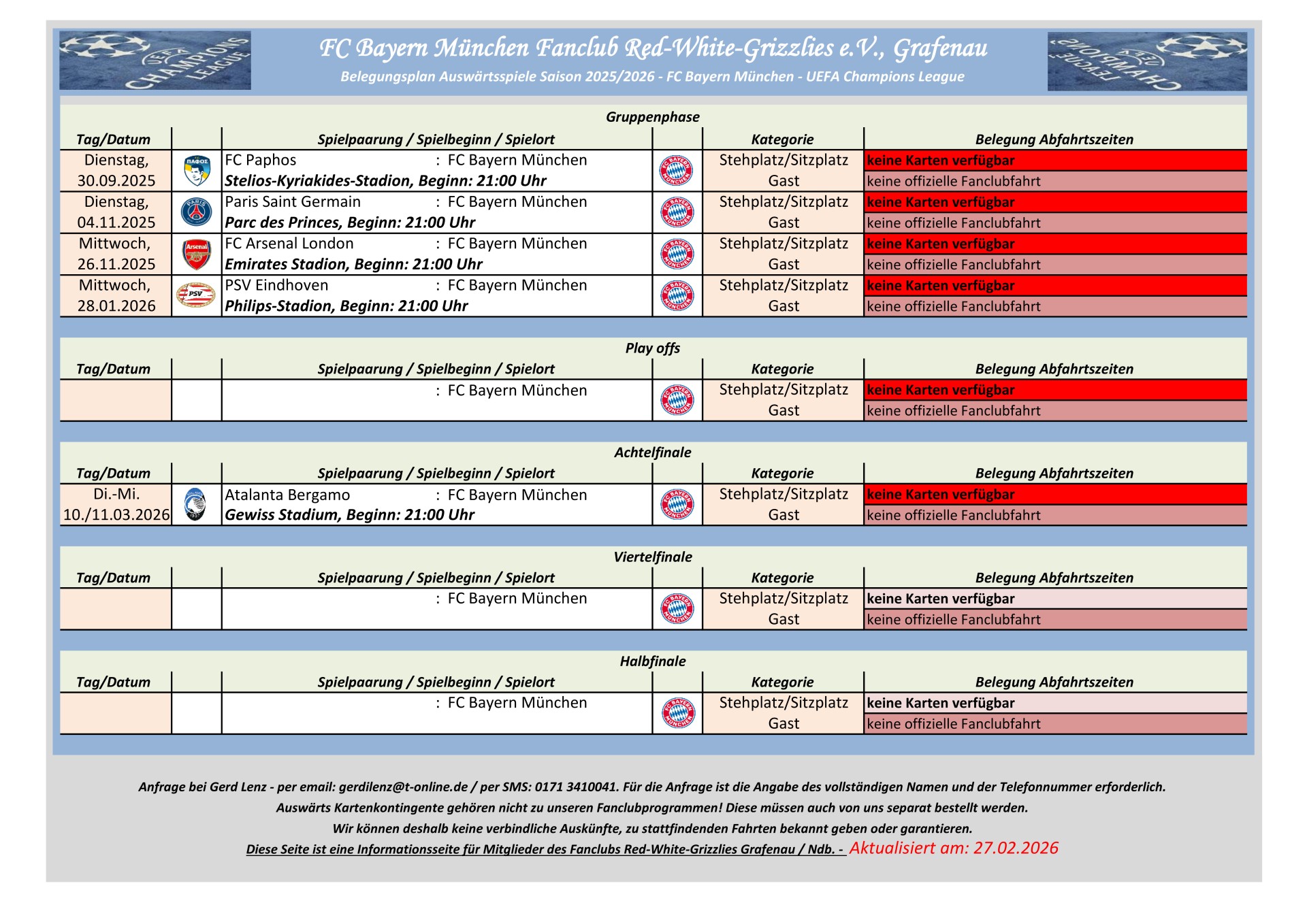 Information für UEFA Champions League Auswärtsspiele: Dem Fanclub Red White Grizzlies e.V., Grafenau steht kein UEFA Champions League Auswärtskontigent zur Verfügung. Eine Zuteilung von UEFA Champions League Auswärtskarten erfolgt nur über Bayern München im Losverfahren. Der Fanclub hat keinen Einfluss auf diese Zuteilung.
