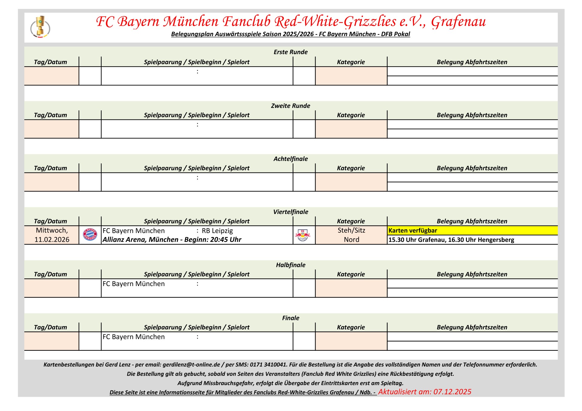 Information für DFB Pokal Auswärtsspiele: Dem Fanclub Red White Grizzlies e.V., Grafenau steht kein DFB Pokal Auswärtskontigent zur Verfügung. Eine Zuteilung von DFB Pokal Auswärtskarten erfolgt nur über Bayern München im Losverfahren. Der Fanclub hat keinen Einfluss auf diese Zuteilung.
